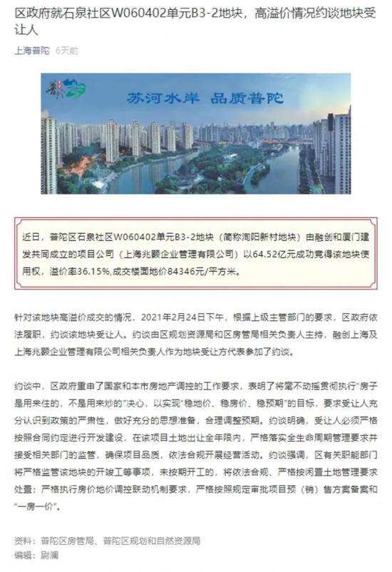 今年2月,上海宅地的首次竞拍中,普陀内中环一幅纯宅地溢价率被推到了36%,经过300多轮竞价被融创和建发联合拿下。紧接着,被约谈的消息就传了出来,其中监管说了一句非常有力的话,“做好充分的思想准备,合理调整预期。”