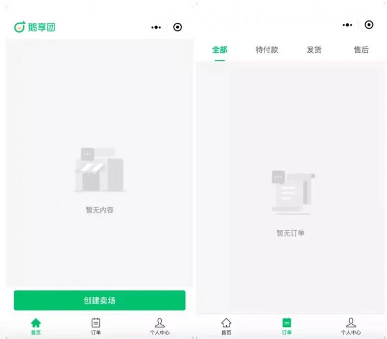在鹅享团的首页,团长需要先创建一个卖场,陈列售卖的商品,团长们可将商品分享到微信群和微信好友内,当有用户购买商品后,团长会在后台收到订单信息,然后由团长开始发货,发出的商品信息会展示在“订单”中。此外,团长还可以在“订单”页面查看商品付款状态以及售后情况,全程跟进动态。