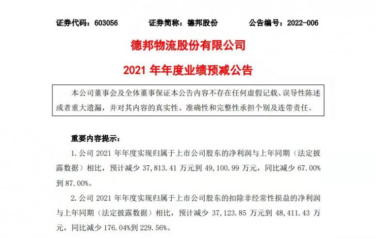 2022年1月28日,德邦股份发布业绩预告,2021年年度实现归属于上市公司股东的净利润与上年同期相比,预计减少约3.78亿元到约4.91亿元,同比减少67%到87%。