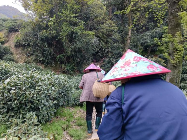 一行平均年龄超过67岁的采茶工正行走在茶田间的小路上