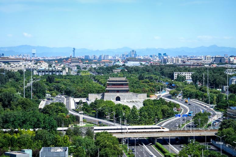 2022年8月16日,一列复兴号高铁列车从位于北京中轴线上的永定门城楼前驶过。