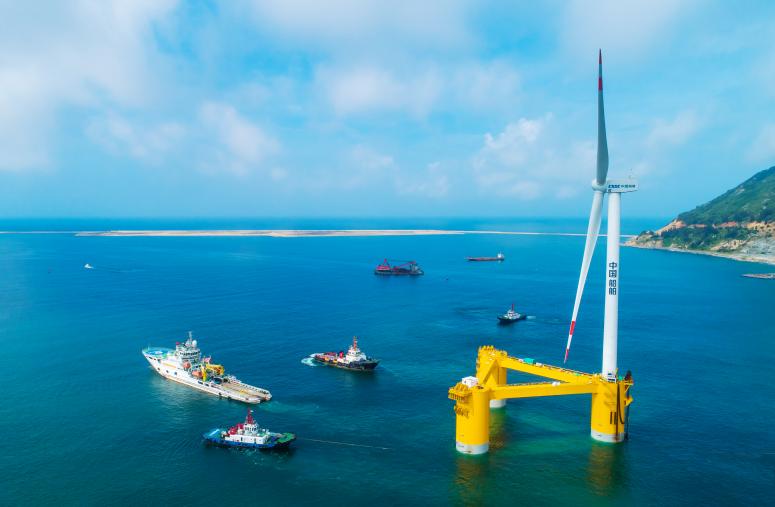 2022年5月29日,国内首台深远海浮式风电装备“扶摇号”从广东省茂名市广港码头拖航前往罗斗沙海域进行示范应用。