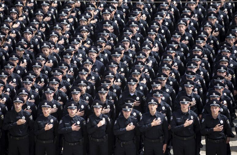 2015年7月4日,乌克兰基辅,警察们在宣誓仪式上演唱国歌。乌克兰于当年对警察部队进行了大规模改革,改善警察在群众中的形象。
