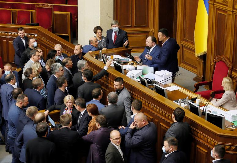 2021年9月23日,乌克兰基辅,反对派议员在最高拉达会议上与第一副议长进行争论,要求投票通过一项反寡头法案。