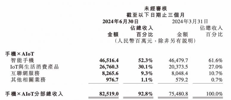从更具体的维度看,包含了智能手机、IoT与生活消费产品、互联网服务及其他相关业务的“手机XAIoT”板块,以825亿收入占到了绝对的大头。