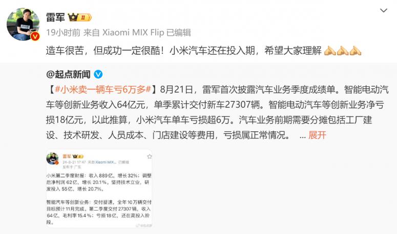 作为小米汽车的掌舵人,雷军很快在微博上回应此事。他表示,“造车很苦,但成功一定很酷。小米汽车还在投入期,希望大家理解。”