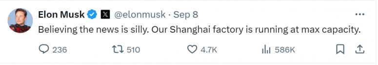 身为特斯拉创始人,埃隆·马斯克毫不犹豫地否定了特斯拉被中国消费者“冷落”的报道,且言辞颇为犀利,“相信这些消息的人是愚蠢的,特斯拉上海工厂正在满负荷运行。”