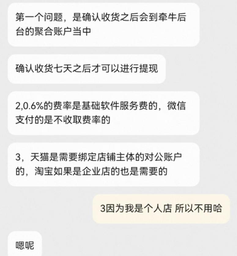 淘宝客服回复《凤凰WEEKLY财经》称,用微信支付的买家收货之后,货款会到千牛后台的聚合账户中,所以确实需要等7天货款才能到商家账户。不过,微信支付并不收取手续费,0.6%的费率是基础软件服务费。而天猫绑定店铺主体的对公账户是针对企业店,如果是个人店则不需要。