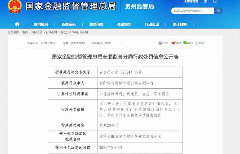 贵阳银行安顺分行因“内部控制薄弱,发生员工盗窃、职务侵占”三项违法违规事实,依据相关法律法规被罚款20万元: