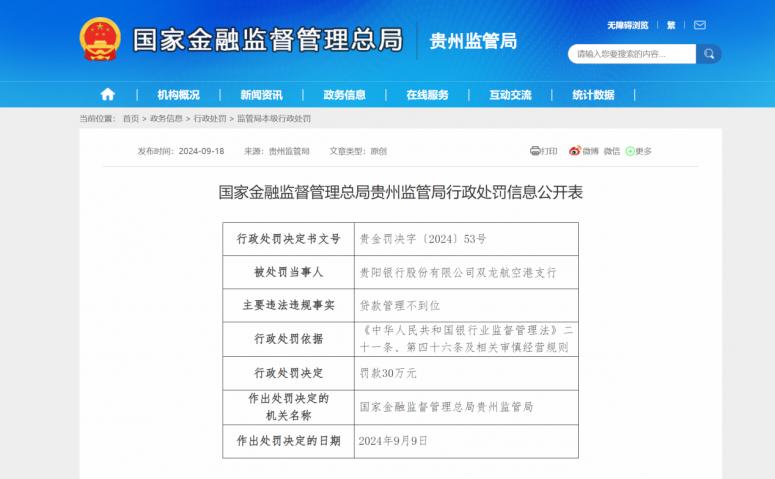 同天,贵阳银行股份有限公司双龙航空港支行因“贷款管理不到位”一项违法违规事实,依据相关行政法规,被处罚款30万元: