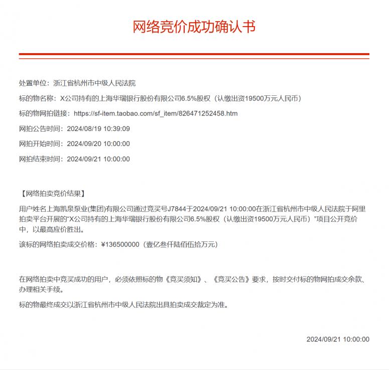 根据竞价结果确认书,上海凯泉泵业(集团)有限公司通过竞买号J7844于2024年9月21日在浙江省杭州市中级人民法院于阿里拍卖平台开展的“X公司持有的上海华瑞银行股份有限公司6.5%股权(认缴出资19500万元人民币)”项目公开竞价中,以最高应价胜出。此次拍卖仅有凯泉泵业一名竞买者,其以协议价的七成起拍价1.365亿元竞得上海华瑞银行股份有限公司的6.5%股份,以28.55%的持股比例一跃成为华瑞银行的第二大股东。
