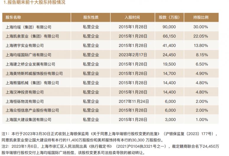 据2023年年度报告披露,华瑞银行的股东持股比例情况发生较大变化,发起股东不断退场。除第一大股东上海均瑶有限公司及其子公司持股30%不变之外。成立之初的第二大股东上海美特斯邦威持股目前已减持至4.9%。第二大股东凯泉泵业的持股比例通过本次竞价拍卖从22.05%提高到28.55%。