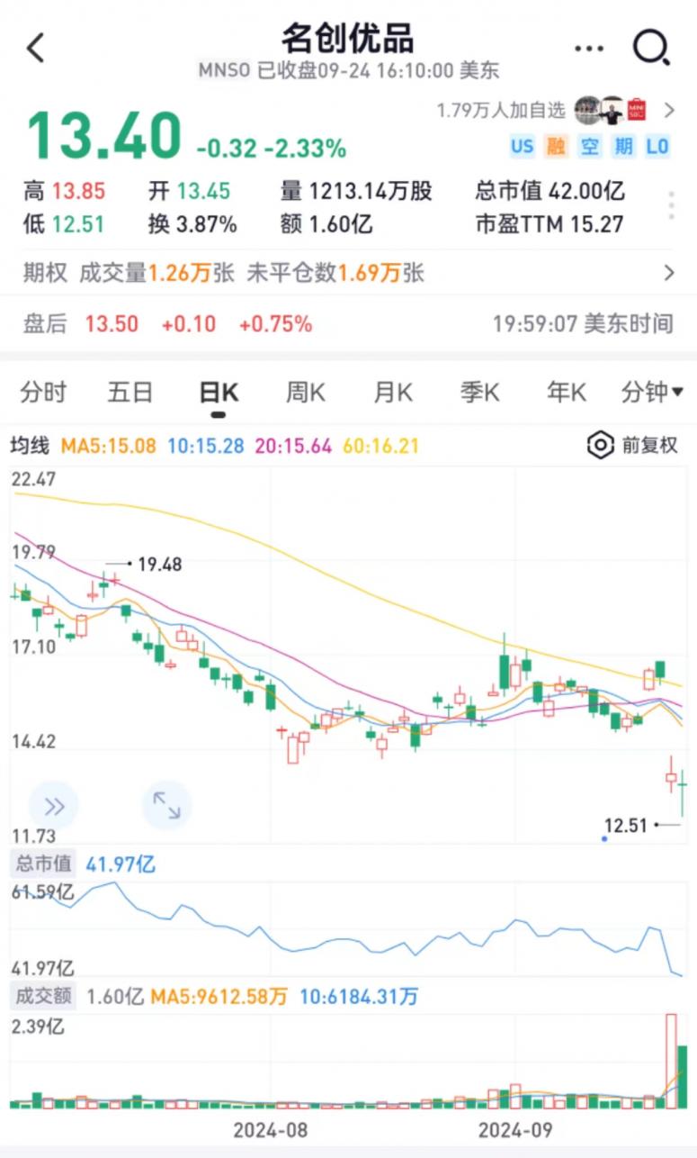 截至9月24日,名创优品美股报收13.4美元/股。