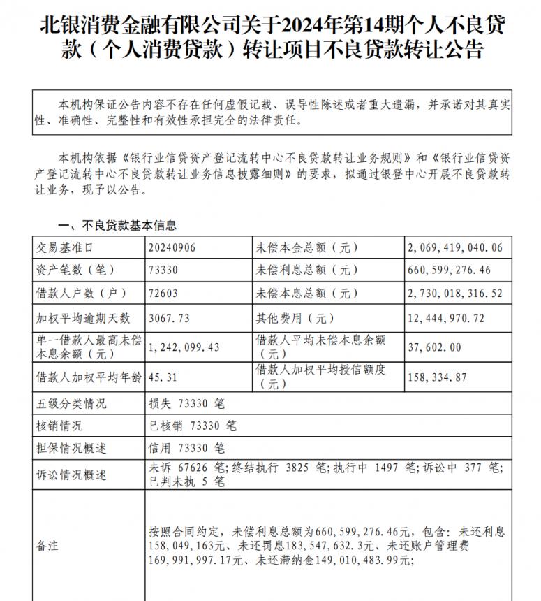 9月24日,银登网公布了北银消金2024年第14期个贷不良资产转让项目,资产包中,涉及未偿本金20.69亿元,未偿利息6.61亿元,未偿本息合计27.30亿元。涉及借还户数7.26万户,借款人平均未偿本息余额为3.76万元,借款人加权平均授信额度高达15.83万元,加权平均逾期天数3067.73天,借款人平均年龄为45.31岁。