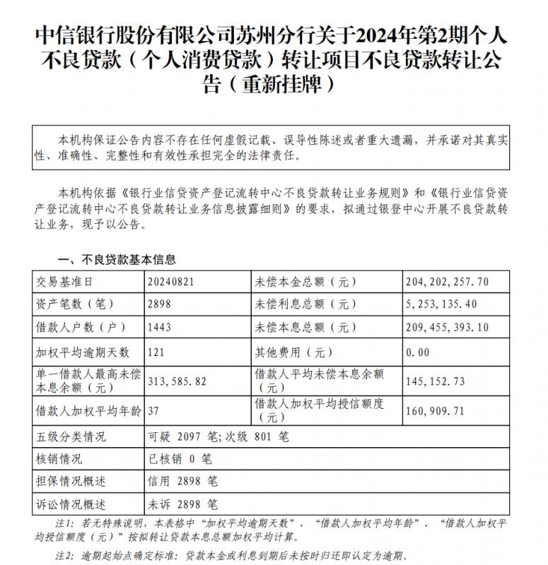 10月8日,银登网公布了中信银行苏州分行2024年第2期个人不良贷款(个人消费贷款)转让项日不良贷款转让公告(重新挂牌),拟转让本息总额2.09亿元,起始转让价格为2864万元。
