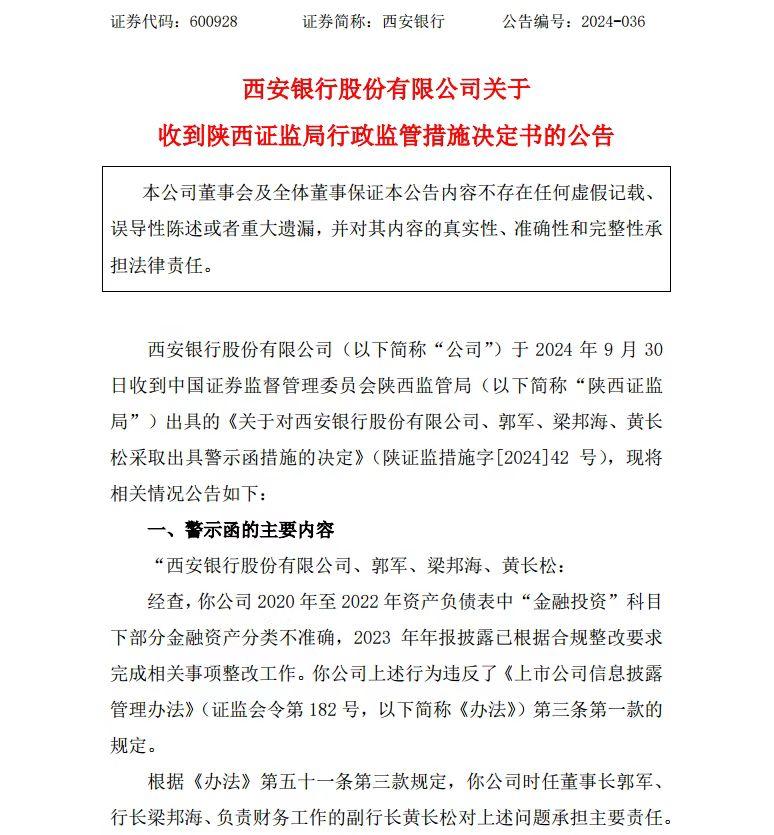 公告显示,西安银行2020年至2022年资产负债表中“金融投资”科目下部分金融资产分类不准确,2023年年报披露已根据合规整改要求完成相关事项整改工作。同时,公司时任董事长郭军、行长梁邦海、负责财务工作的副行长黄长松对上述问题承担主要责任。陕西证监局要求西安银行及相关责任人认真汲取教训,采取有效措施提高财务信息披露质量,防止类似违规行为再次发生,并在收到决定书后的十五个工作日内提交书面整改报告。