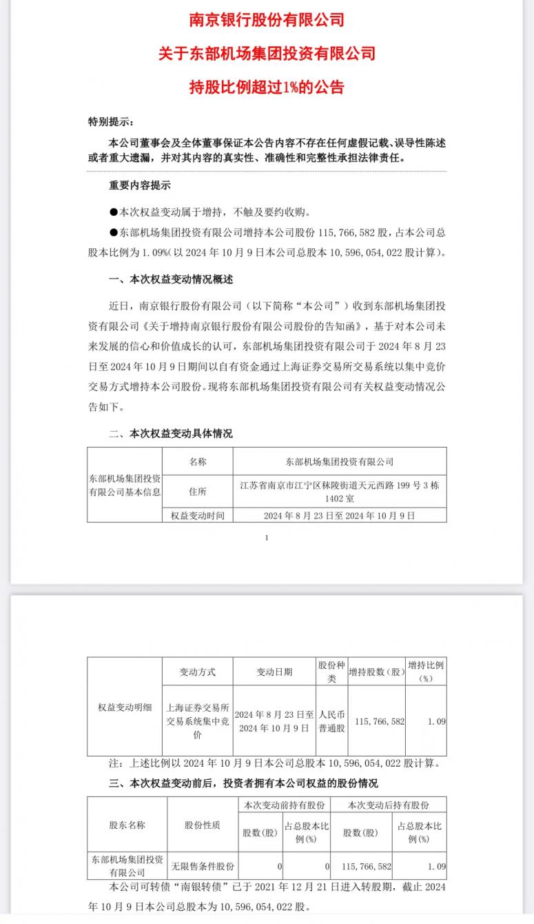 据南京银行股份有限公司发布公告披露,东部机场集团投资有限公司于2024年8月23日至2024年10月9日期间增持该公司股份115,766,582亿股,占总股本比例为1.09%,