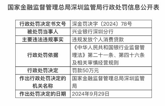 近日,据国家金融监督管理总局深圳监管局行政处罚信息公开表披露,兴业银行深圳分行因违规发放个人消费贷款,被国家金融监督管理总局深圳监管局罚款50万元。