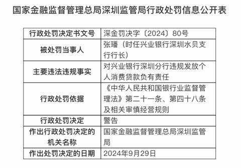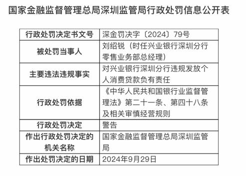 同时,刘绍锐(时任兴业银行深圳分行零售业务部总经理)、张璠(时任兴业银行深圳水贝支行行长)因对兴业银行深圳分行违规发放个人消费贷款负有责任,被国家金融监督管理总局深圳监管局警告。