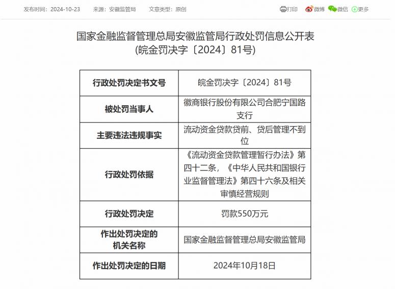 10月23日,据金融监管总局安徽监管局披露的信息显示,徽商银行合肥宁国路支行因多项违规行为,于10月18日被安徽监管局罚款550万元。