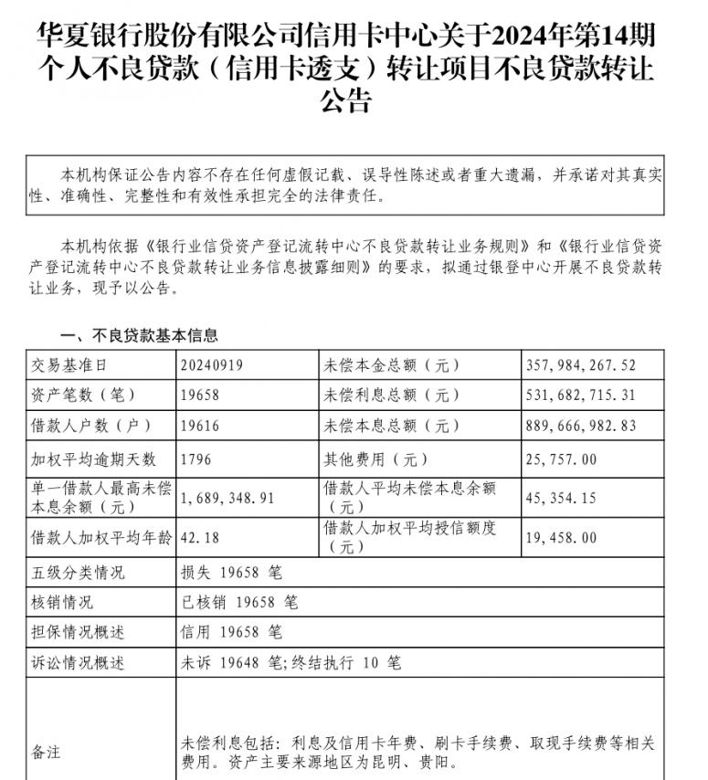 近日,银登网公布了华夏银行股份有限公司(以下简称“华夏银行”)信用卡中心关于2024年第14期个人不良贷款(信用卡透支)转让项目不良贷款转让公告,拟转让本息总额8.90亿,起始价为1990万元。