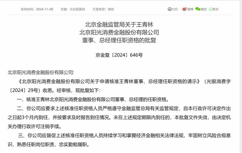 近日,北京金融监管局发文称,核准王青林北京阳光消费金融股份有限公司(以下简称“阳光消金”)董事、总经理的任职资格。