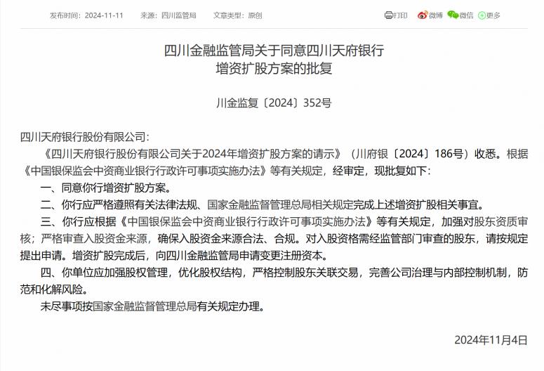 11月11日,据四川金融管理局官网信息披露,四川天府银行股份有限公司(以下简称“天府银行”)关于2024年增资扩股方案已获批准。