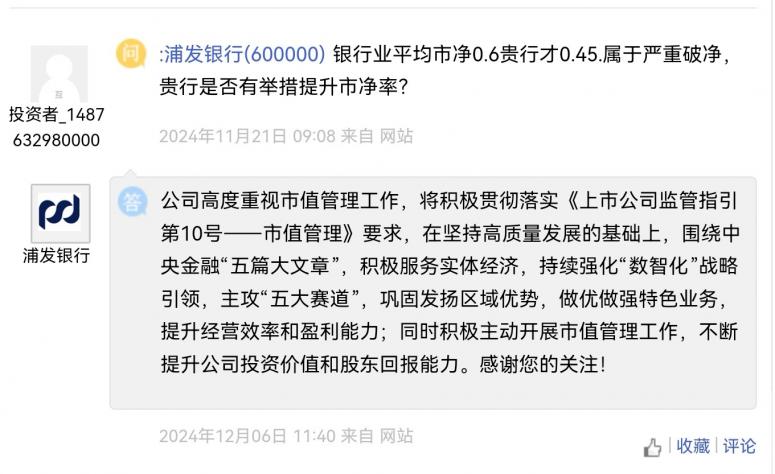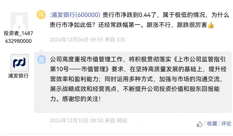 浦发银行回复称,公司高度重视市值管理工作,将积极贯彻落实《上市公司监管指引第10号——市值管理》要求。同时积极主动开展市值管理工作,不断提升公司投资价值和股东回报能力。