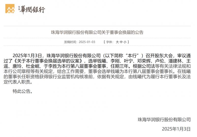 近日,珠海华润银行股份有限公司(以下简称“华润银行”)召开股东大会,审议通过了《关于本行董事会换届选举的议案》,选举钱曦、李刚、叶宁、邓荣辉、卢伦、潘建林、王遥、唐玲、杜金岷、于李胜为华润银行第八届董事会董事,任期三年,选举钱曦为华润银行第八届董事会董事长。在钱曦的董事长任职资格获得银行业监管机构核准前,依据有关规定,由钱曦代为履行本行董事长及法定代表人职责。