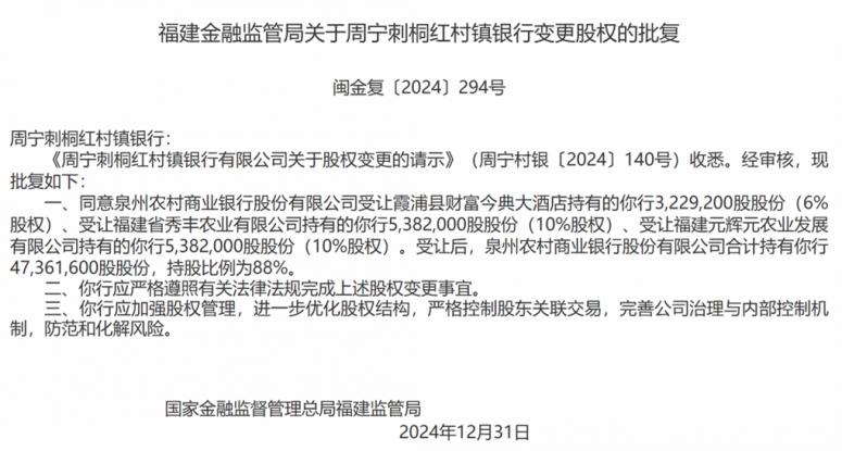 近日,国家金融监督管理总局福建监管局发布多则批复,同意泉州农村商业银行股份有限公司(以下简称“泉州农商行”)受让周宁刺桐红村镇银行、柘荣刺桐红村镇银行、古田刺桐红村镇银行、寿宁刺桐红村镇银行、蕉城刺桐红村镇银行及霞浦刺桐红村镇银行6家村镇银行股权,受让后,泉州农商行上述6家银行的持股比例分别为88%、70.6%、73.95%、79.3%、61%及87%。