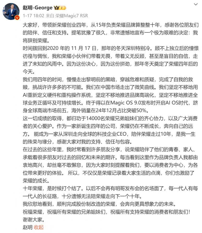 他提到了曾经的奋斗历程,提到了荣耀如何用AI重新定义硬件和重构操作系统,坚定推进品牌高端化。他的文字中满是不舍、遗憾,但仍祝福荣耀奔向更好的未来。在公司内网他表示,自己将调整与修复不堪重负的身体,陪伴家人,读读书,完善自己。