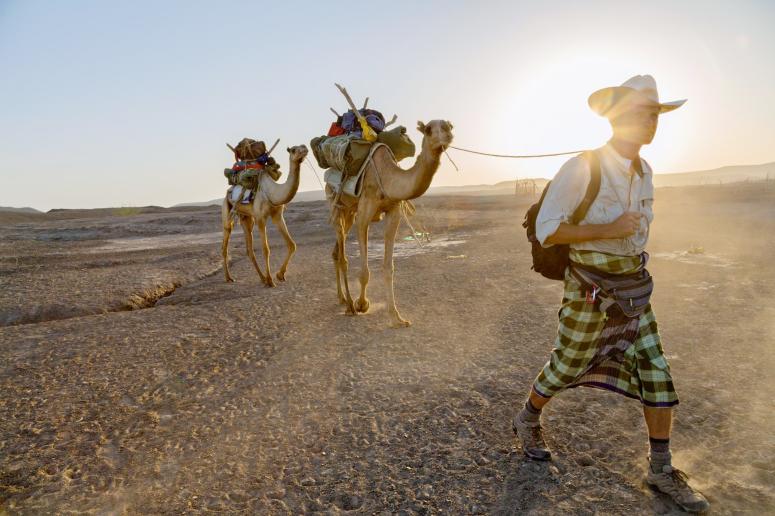 保罗·萨洛佩克牵着骆驼穿越埃塞俄比亚的沙漠。