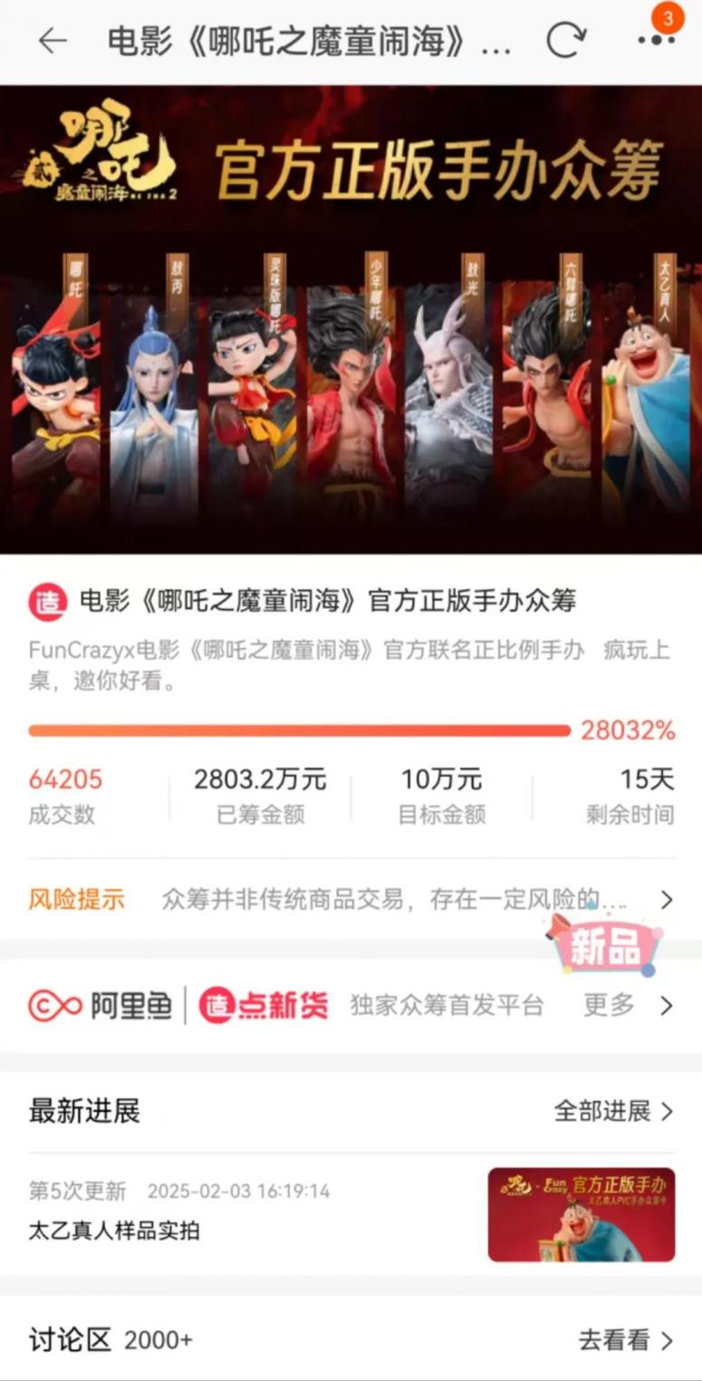 同时,FunCrazy与《哪吒2》官方联名正版手办众筹项目也远超目标金额10万。截至2月14日上午,其实时众筹金额已突破2803.2万元,成交数高达64205件。