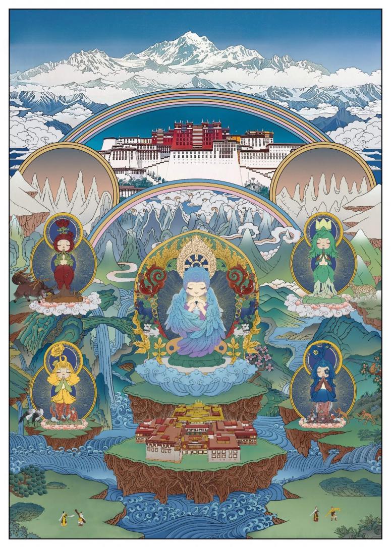 为了印证文化沉淀的必要性,藏狐扎根西藏主题IP开发,希望以工匠式创作突破快餐化生产模式:耗时半年推翻七次设计稿,依托西藏自治区林芝市的山山水水,将当地的5种珍稀植物转化为承载环保议题的潮玩符号——雪莲花对应全球变暖,大花黄牡丹象征化学污染、绿绒蒿隐喻白色污染,每个形象都是在地文化基因与现代议题的有机融合。