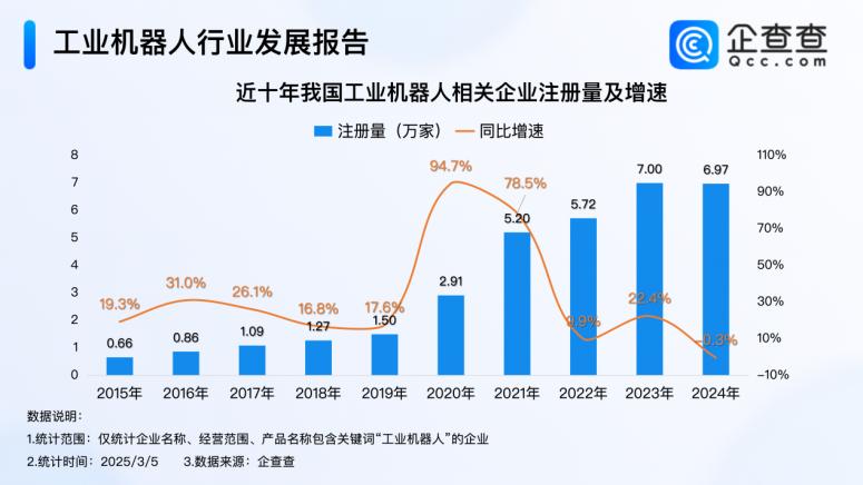 另据企查查数据显示,我国现存32.3万家工业机器人相关企业。近十年相关企业注册量持续增加,仅2024年就注册近7万家。行业分布上,近1/3企业从事科学研究和技术服务业,其次则为从事批发和零售业及制造业的企业,分别占比22.7%和19.1%。