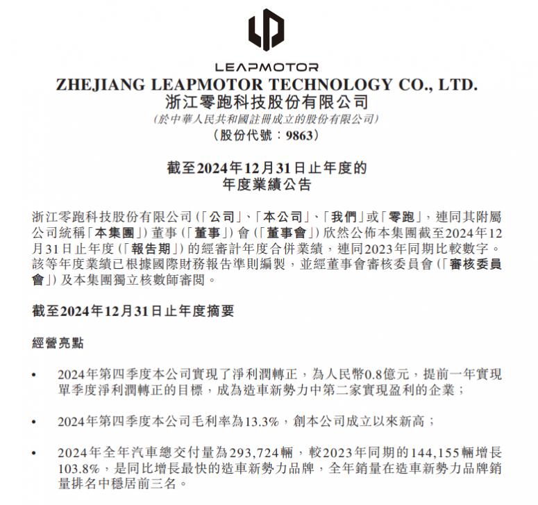 财报显示,零跑在2024年第四季度实现净利润转正,达到0.8亿元,提前一年实现了单季度净利润转正的目标,成为造车新势力中第二家实现盈利的企业。