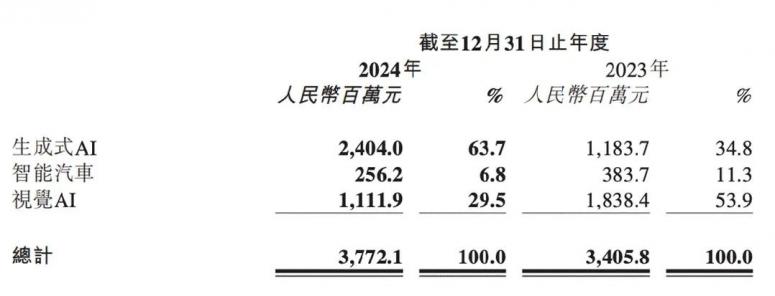 在商汤重点押注的生成式AI领域,收入达到24亿元,同比增长103.1%,占集团收入比例进一步提升至63.7%。