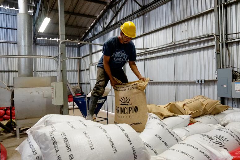 在洪都拉斯苏比拉纳的合作社仓库里,一名当地合作社员工提起一袋加工好的咖啡豆,准备出口。