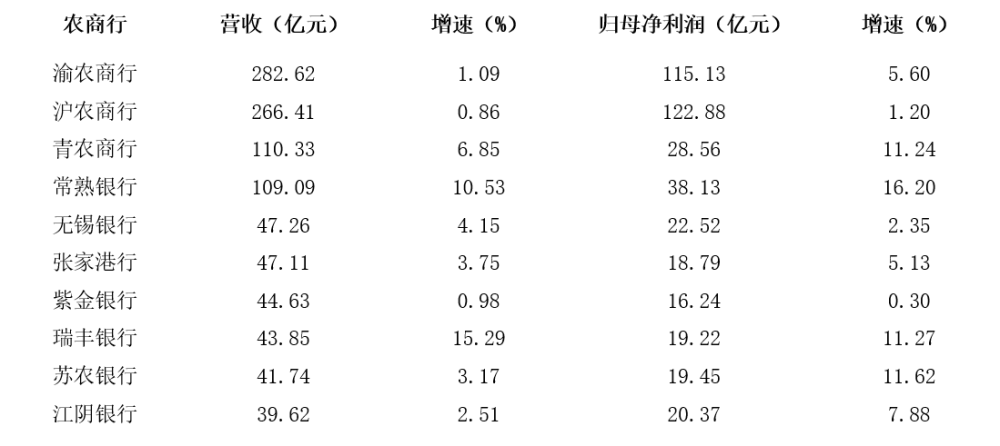 归母净利润方面,沪农商行、渝农商行净利超百亿元,分别为122.88亿元和115.13亿元,常熟银行实现净利38.13亿元,排名第三。除上述3家银行外,其余银行净利均未超过30亿元,紫金银行、张家港行、瑞丰银行及苏农银行净利低于20亿元。常熟银行、苏农银行、瑞丰银行和青农商行净利增速较快,分别达16.20%、11.62%、11.27%和11.24%。