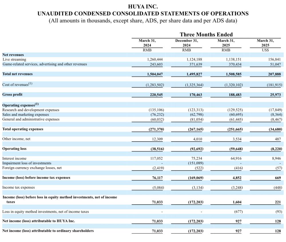 5月13日晚间,虎牙公司发布的2025年一季度财报显示,报告期内,总收入为15.08亿元(约合2.079亿美元),相较于2024年同期的15.04亿元人民币实现微增。