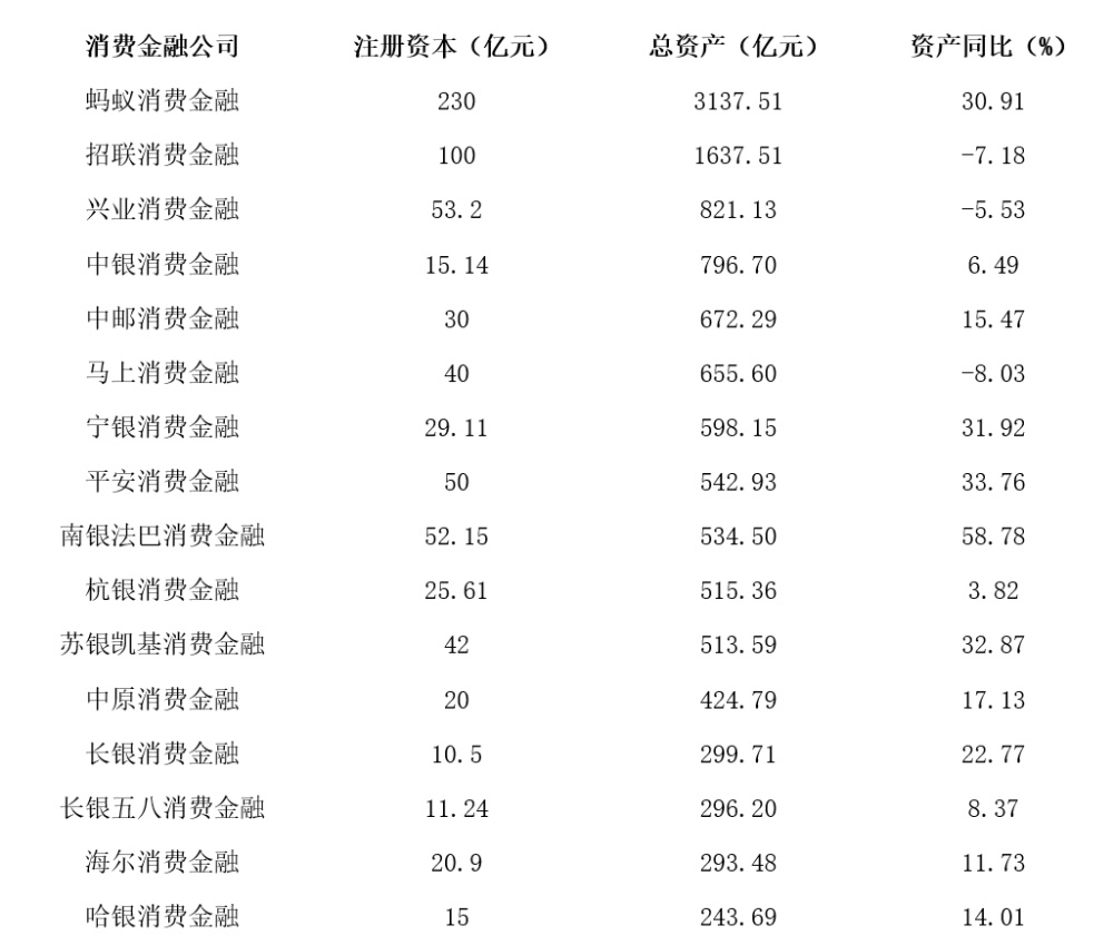 31家消费金融公司注册资本、总资产