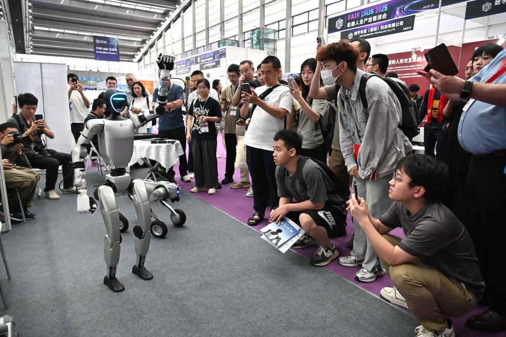 2025年4月24日,深圳,在机器人全产业链接会(FAIR plus 2025)上,宇树科技G1人形机器人前围满好奇人群。