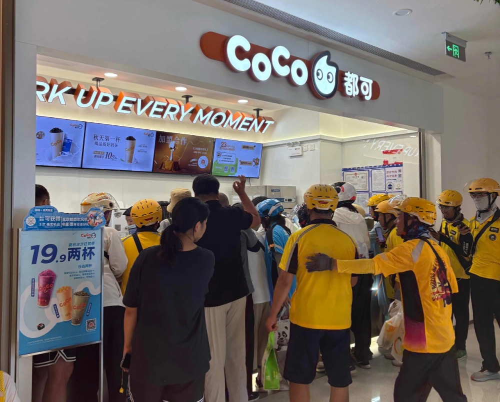 订单小票如秋叶般铺满柜台,外卖小哥在奶茶店门口围成一堵焦虑的“人墙”。