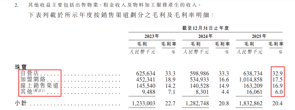加盟店的优点明确,弊端也不容忽视。招股书显示,2025年,潮宏基珠宝业务加盟代理销售模式的毛利率仅为17.5%,自营、网络销售模式的毛利率为34.9%、16.9%。