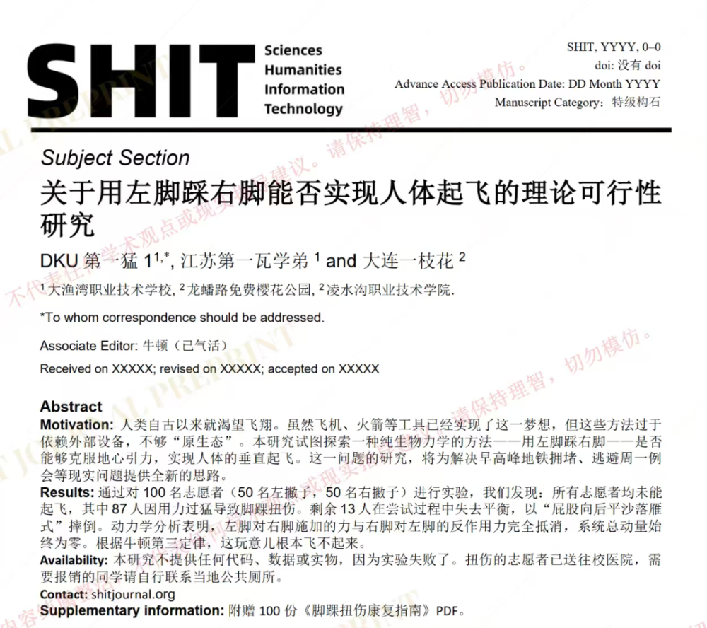 名为《S.H.I.T》的“学术底刊”网站上,一群中国最聪明的脑子正在认真推演这个看似荒诞的命题。他们招募了100名志愿者开展实验,并在过程中运用牛顿第三定律进行力学分析,最终没有一个人成功离地10厘米,因此得出了“不能起飞”的结论。