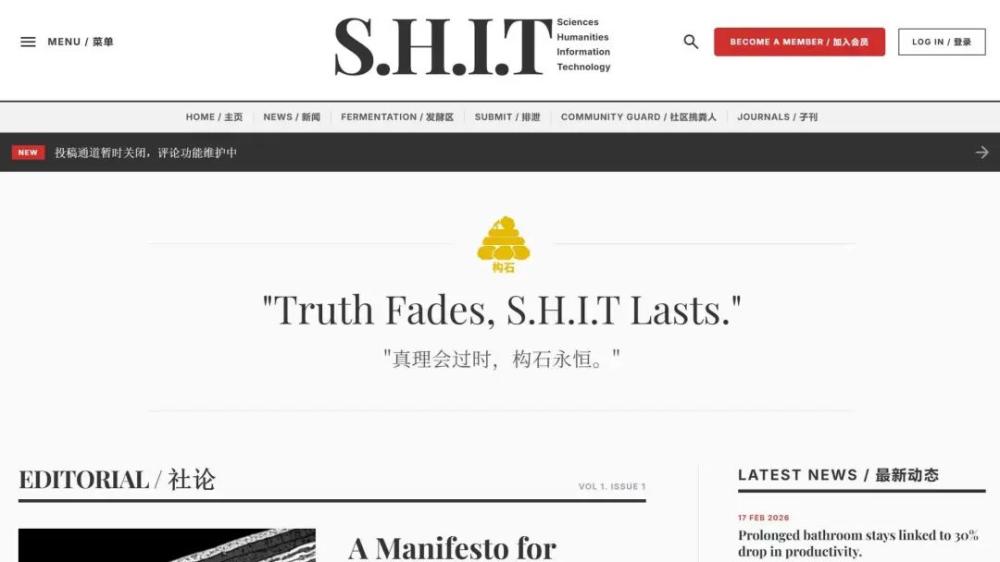 《S.H.I.T》源自英文俚语“shit”,被刻意音译为“构石”。这一带有玩笑意味的翻译,被赋予了一层反讽意味——既是废物,也是“构建学术的基石”。网站最醒目的位置放着一个金色标志,以及宣言: