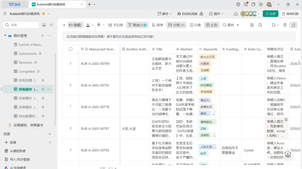 但这反而让《Rubbish》编辑部的成员们靠得更紧。他们不再像之前那样,只通过共享文档和平台群聊联络,而是建立起更稳定的结构:多平台运营、独立网站、明确分工,并开始更加认真地对待每一篇投稿。三月初,为了处理数目庞大的投稿,陈扬和其他主创们决定正式组建一个审稿团队,由30余位硕博生、高校青年教师构成。