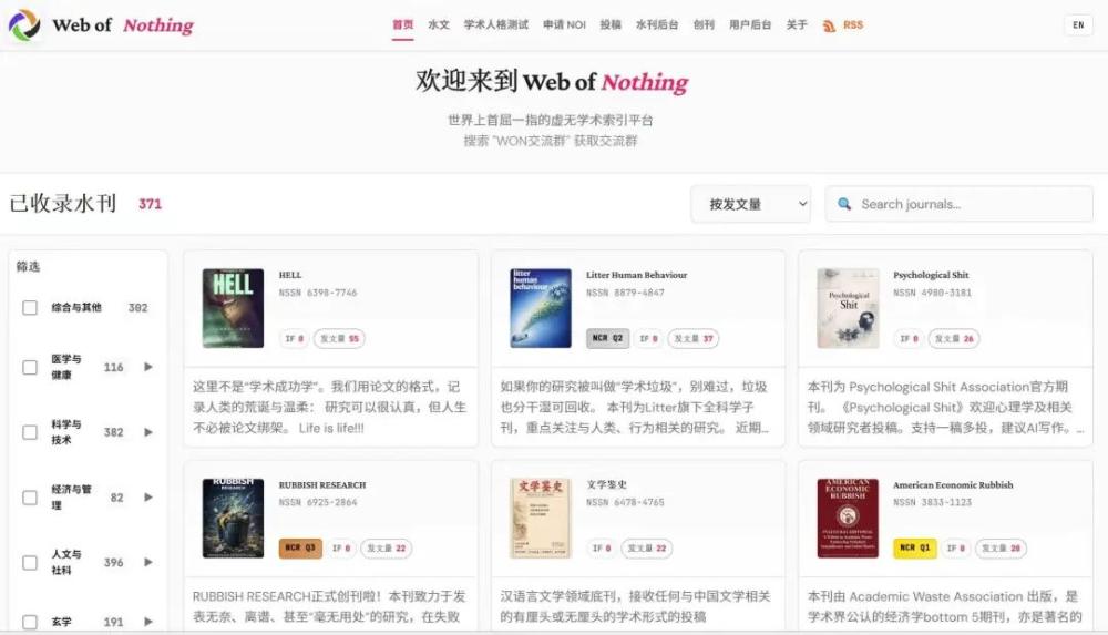 远在意大利读博的黄家轩,则利用搭建生物信息数据库的思路,做出了一个名为WoN(Web of Nothing)的检索网站,收录各类底刊,如今已有近400本,涵盖医学、科技、经管、人文社科甚至玄学等类别。