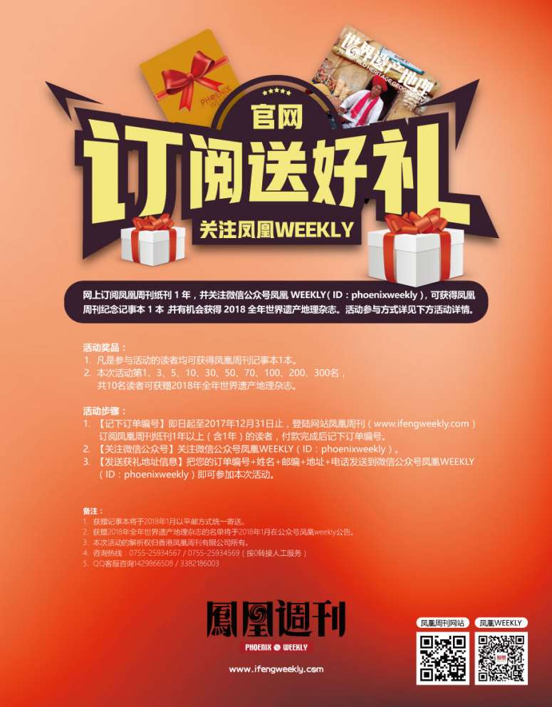 网上订阅凤凰周刊纸刊1年,并关注微信公众号凤凰WEEKLY (ID:phoenixweekly),可获得凤凰周刊纪念记事本1本,并有机会获得2018全年世界遗产地理杂志。活动参与方式详见下方活动详情。