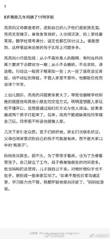 乍一看,8岁的亮亮是个讨人喜欢的小正太。他活泼爱笑,学习成绩也不错。然而,才上小学二年级的他已经被3所幼儿园、8所小学勒令退学,而且每次都是同学家长联名要求,理由是“不适宜行为”。 亮亮患有阿斯伯格综合征,因为牛顿、爱因斯坦等历史名人都为阿斯伯格人士,人们将此症称之为天才病。